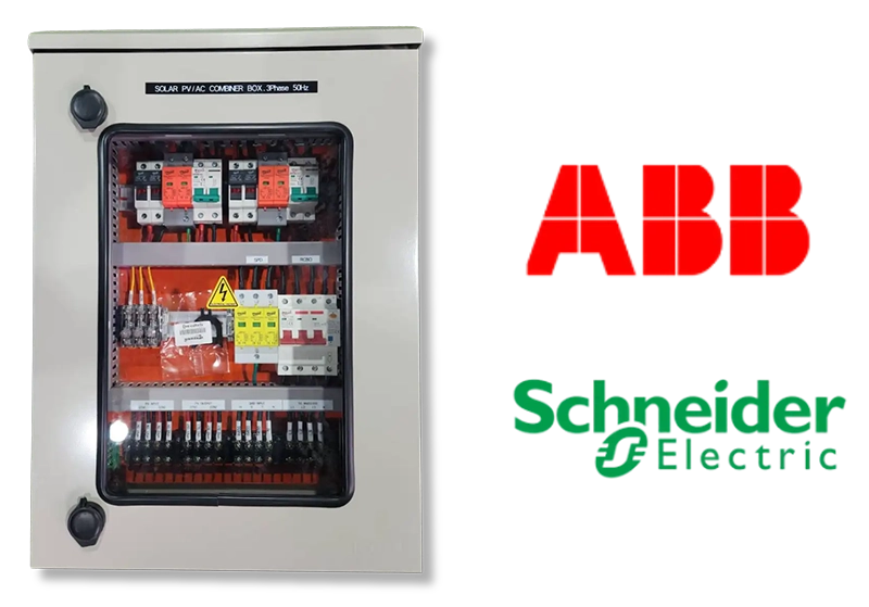 SolEn เลือกใช้อุปกรณ์ภายในตู้ Combiner จากแบรนด์ชั้นนำอย่าง ABB และ Schneider ที่ได้มาตรฐานและเชื่อถือได้ ออกแบบโดยวิศวกรผู้เชี่ยวชาญ โดยให้ความสำคัญสูงสุดกับ ความปลอดภัย พร้อมติดตั้งอุปกรณ์ครบ เช่น RCBB, Surge, MCB และ MCBB ตัวตู้แข็งแรง ทนทาน สวยงาม และจัดวางอย่างเป็นระเบียบ